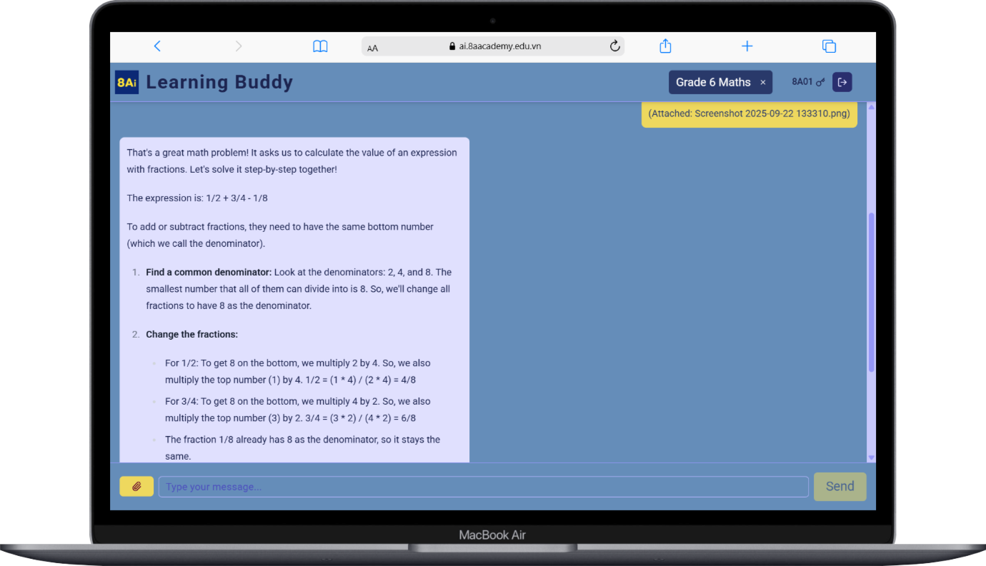8Ai Learning Buddy là trợ lý học tập được độc quyền phát triển bởi 8A Academy, phù hợp học sinh cấp Tiểu học & THCS đang theo học chương trình Bộ GD&ĐT, Song ngữ/Quốc tế cũng như các chương trình 8A Cambridge International.